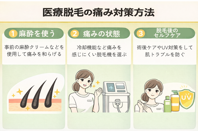 特にVIOやヒゲ、ワキなどは痛みが出やすいと言われていますが、麻酔・出力調整・機器選び・保湿とUV対策などで軽減できる可能性があります。