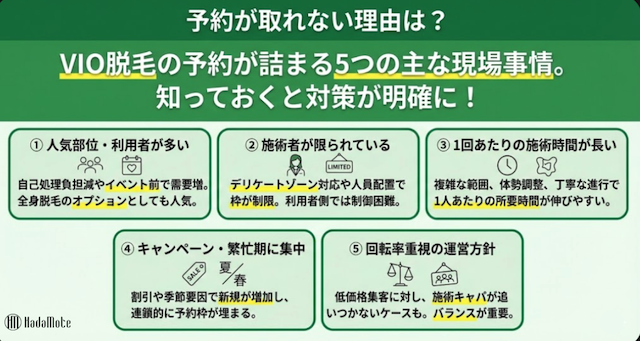 VIO脱毛の予約が取れないのは、人気部位であることに加えて施術者・施術時間・繁忙期・予約運用などが重なって起こりやすい現象です。
