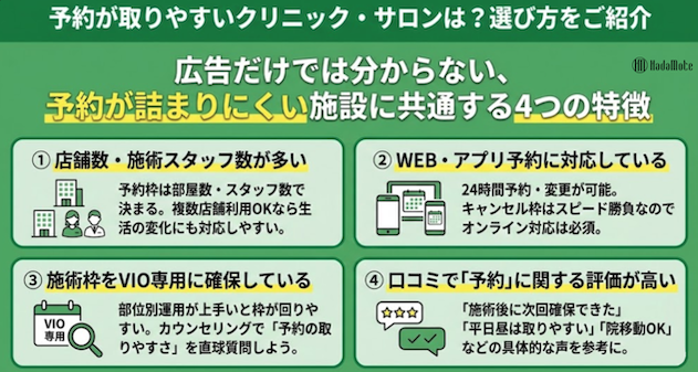 VIO脱毛は「効果」や「料金」だけでなく、予約の取りやすさで満足度が大きく変わります。