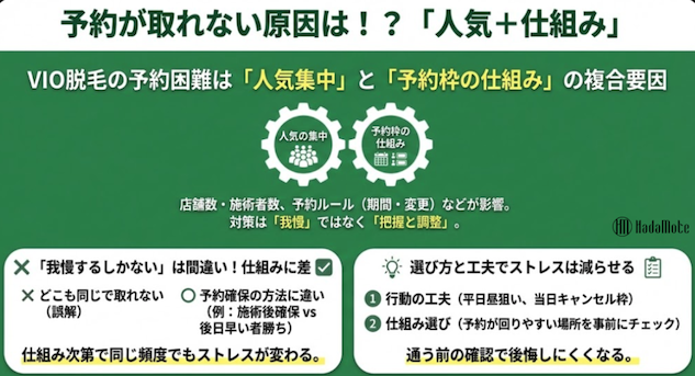 VIO脱毛の予約問題は「混んでいるから」で片付けられがちですが、実際は人気の集中と予約枠の仕組みが合わさって起こることが多いです。
