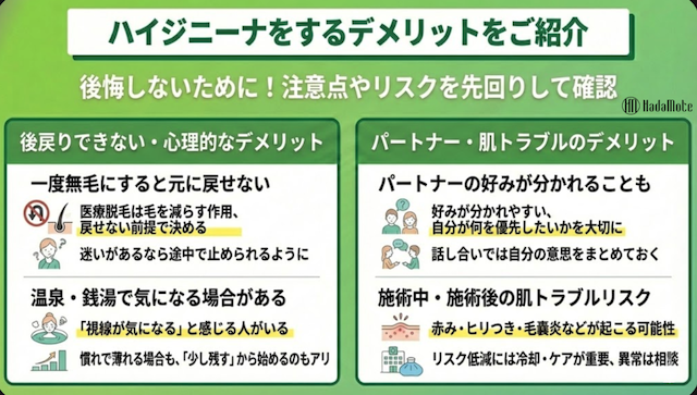 ハイジニーナはメリットが分かりやすい一方で、決めてから気づく落とし穴もあります。