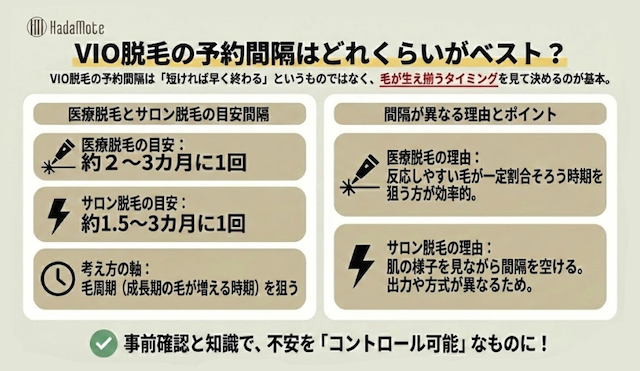 VIO脱毛を始めるときに多い悩みが「次の予約はいつが正解?」「間が空くと効果が落ちる?」という予約間隔の不安です。