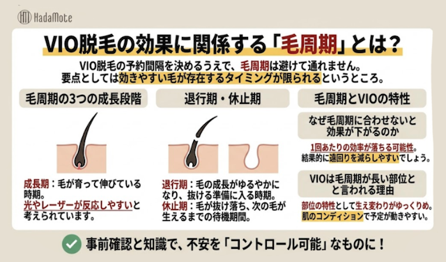 つまり、VIOは「毛周期が長い」だけでなく「肌のコンディションで予定が動きやすい」部位でもあります。