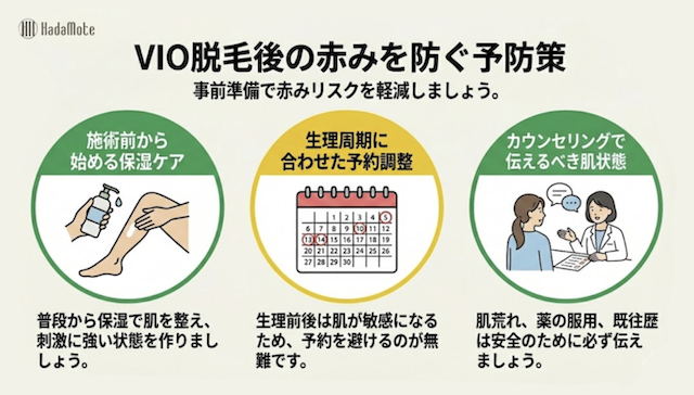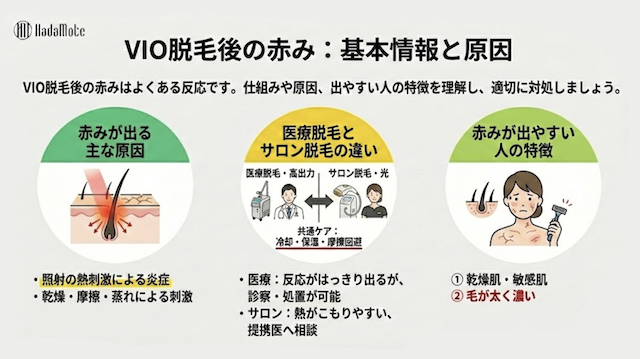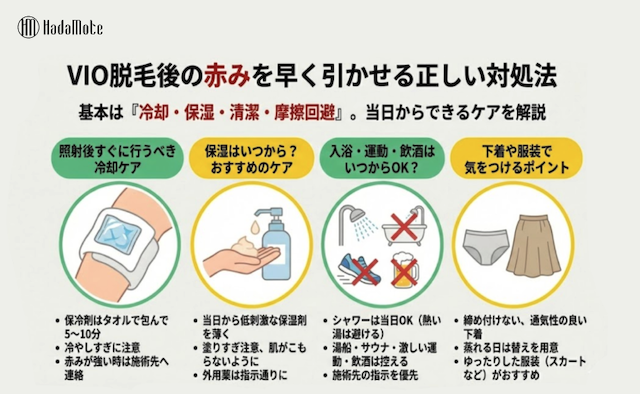 VIO脱毛後の赤みは、熱刺激・乾燥・摩擦や蒸れなどが重なって起こることがあり、当日〜数日で落ち着くケースも少なくありません。