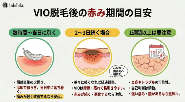 VIOは摩擦や蒸れの影響を受けやすいため、腕や脚より長引く可能性があります。
