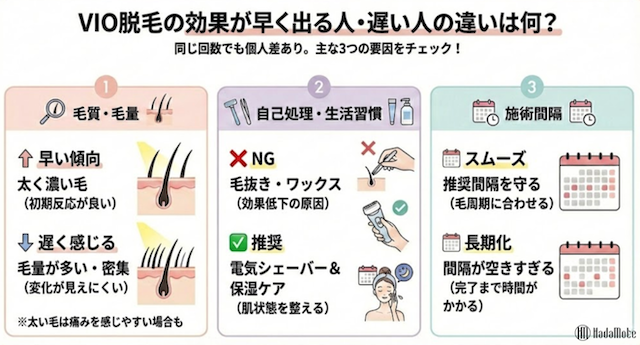 効果が早い・遅いの差は毛質毛量だけでなく「自己処理の方法」「保湿」「施術間隔」などの影響もあることが特徴です。