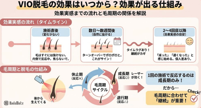 VIO脱毛の効果は、施術直後に一気に変わるというより毛周期に合わせて数回かけて段階的に実感していく流れになりやすいです。