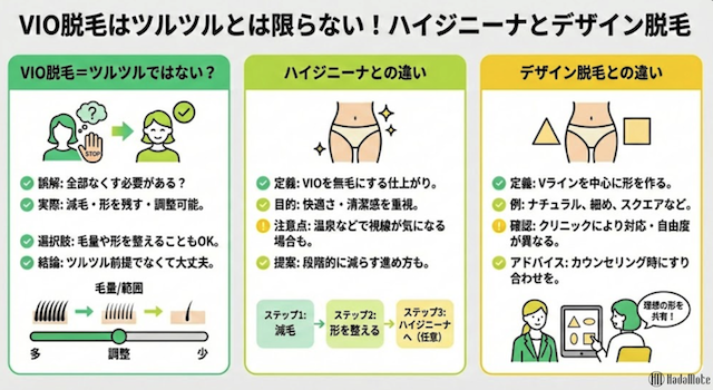 VIO脱毛は名称さえ分かればシンプルに見えますが、実際は「範囲の定義」と「仕上がりの選択肢」で差が出やすい施術です。