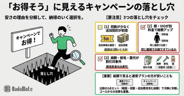 全身脱毛キャンペーンはお得に見えますが、実際は「何がいくら安くなるか」を把握しないと判断しづらいです。