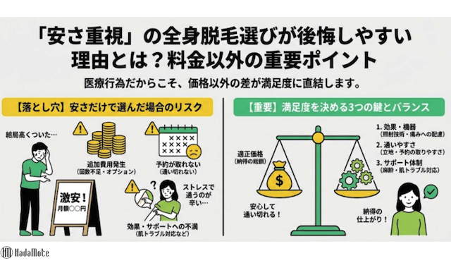 ただ、全身脱毛は回数も金額も大きくなりやすいため、比較検討の時間を取る方が安全です。