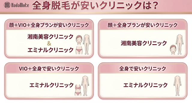 | 顔+VIO+全身プランで 安いクリニック | ・湘南美容クリニック【1回あたり約17,500円】 ・エミナルクリニック【1回あたり約16,300円】 |