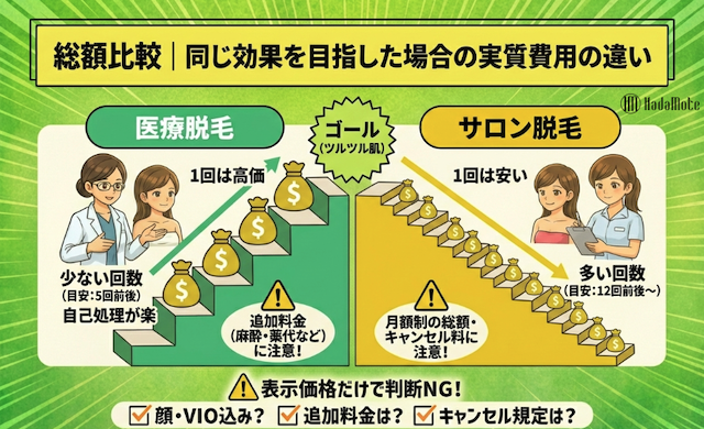 全身脱毛の相場は、医療脱毛とサロン脱毛で「回数」と「追加費用」が異なるため、同じ土俵で比べないと判断を誤りやすいです。