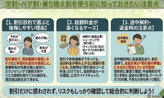 割引を最優先にすると、照射範囲や追加費用・通院のしやすさなど本質的な部分が後回しになりがちです。