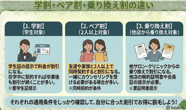 全身脱毛の学割・ペア割・乗り換え割は、条件に合えば費用を下げやすい便利な制度です。