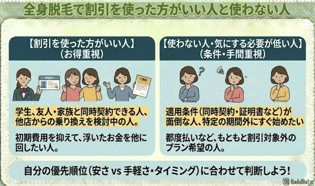 【まとめ】全身脱毛の割引は「条件に合う人だけ」使うのが正解