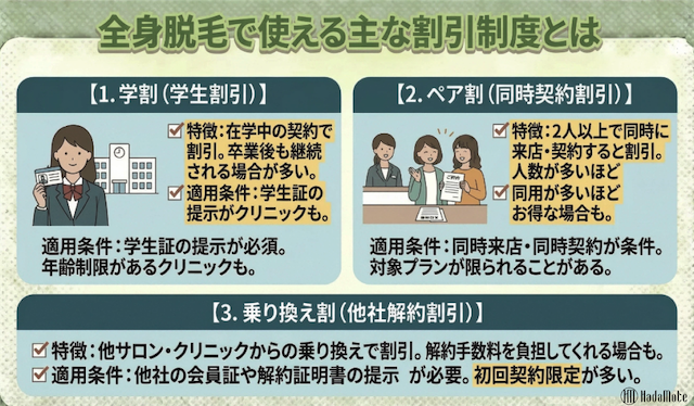この記事では、全身脱毛で使われる代表的な割引制度を整理し、違い・向いている人・注意点までまとめて解説します。