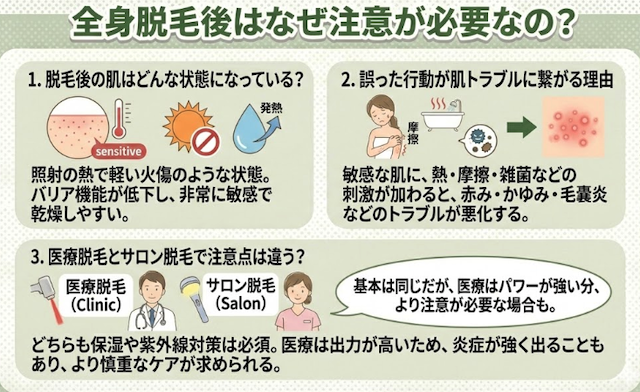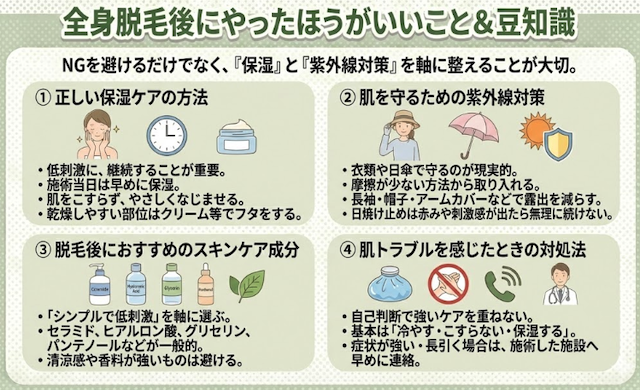全身脱毛後は「温める・こする・刺激する」を避けるのが結論で、これだけでも肌荒れのリスクは下げやすいです。