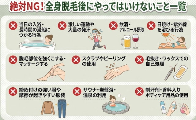 全身脱毛後にやってはいけないこと(NG)は、入浴・運動・飲酒・日焼け・摩擦・毛抜きなど「刺激や炎症を増やす行動」を避ける点に集約されます。
