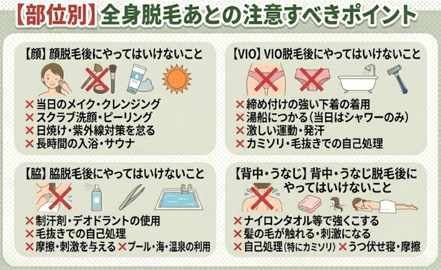 この記事では、全身脱毛後のやってはいけないこと(NG行動)を網羅的に整理し、部位別の注意点と今日からできる正しいアフターケアまでまとめました。