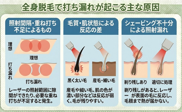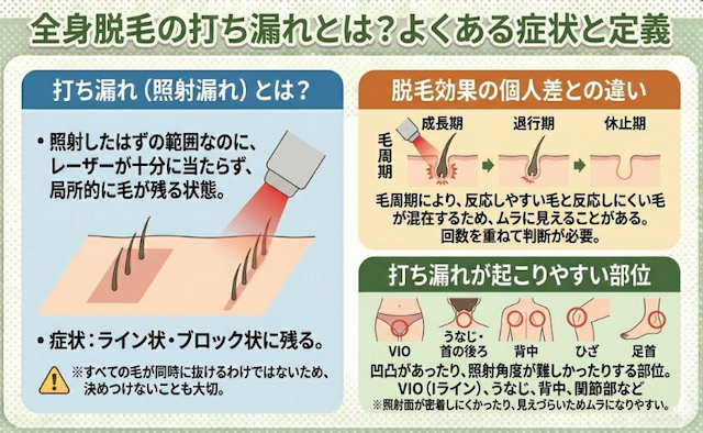全身脱毛で毛が残っているとき、打ち漏れの可能性はありますが、毛周期や方式の違いでそう見えるだけの場合もあります。