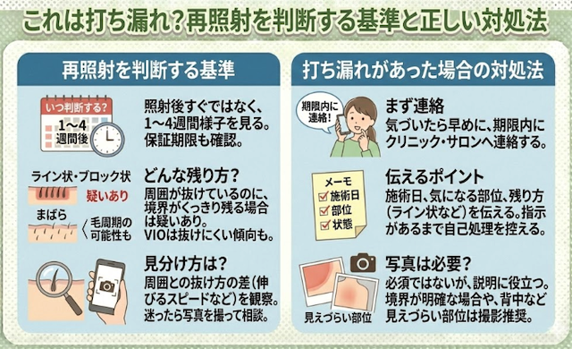 照射方式や毛の抜け時期により判断が難しい場合もあるため「何週間以内に連絡が必要か」「自己処理はしてよいか」などを事前に聞いておくのが現実的でしょう。
