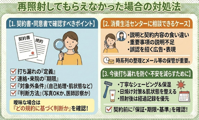 また、契約前の段階なら「再照射保証の有無」「期限」「判断基準」を確認しておくと、不安がかなり減ります。