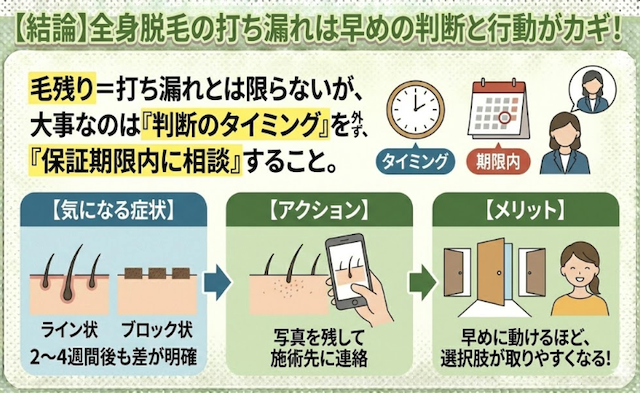 【結論】全身脱毛の打ち漏れは早めの判断と行動がカギ!