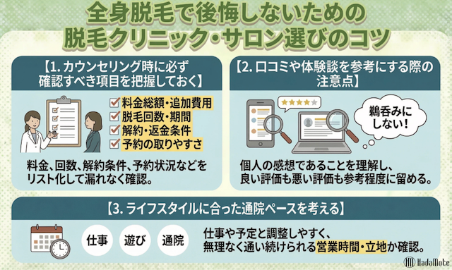全身脱毛で後悔しないための脱毛クリニック・サロン選びのコツ