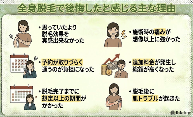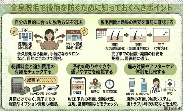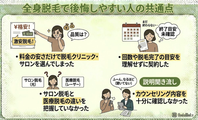 全身脱毛の後悔は、効果・痛み・予約・費用・期間・肌トラブルといった「ズレ」から起こりやすい一方、契約前の確認で回避できる部分も多いです。