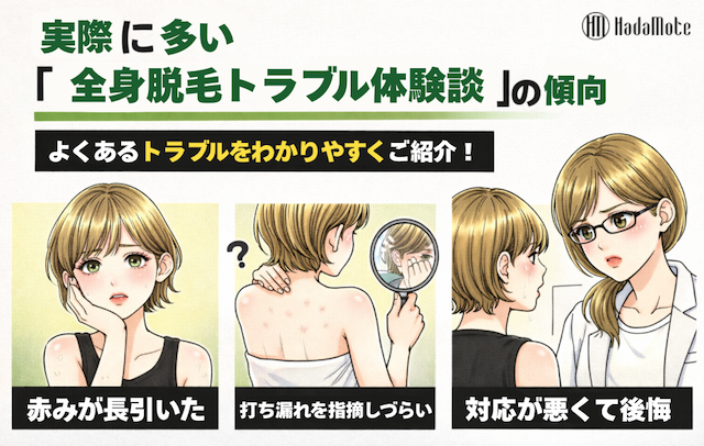 全身脱毛のトラブルは、赤み・ヒリつきのような一時的な反応から、やけどや打ち漏れのように対応が必要なものまで幅があります。