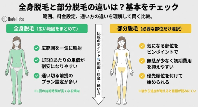 最初に押さえたいのは、全身と部分の違いは「範囲」だけでなく、料金設定と通い方にも差が出る点。