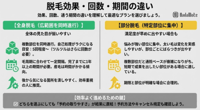 全身脱毛と部分脱毛の違いは、範囲だけでなく料金の組み立て方・通い方・仕上がりの一体感にまで広がります。