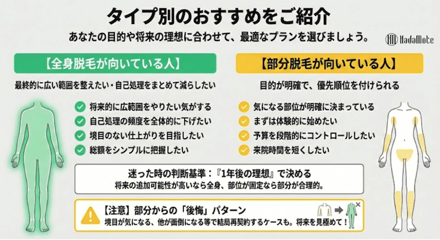 特に「腕+脚+脇+胴回り」など、広い範囲を最初から想定しているなら全身プランのほうがシンプルです。