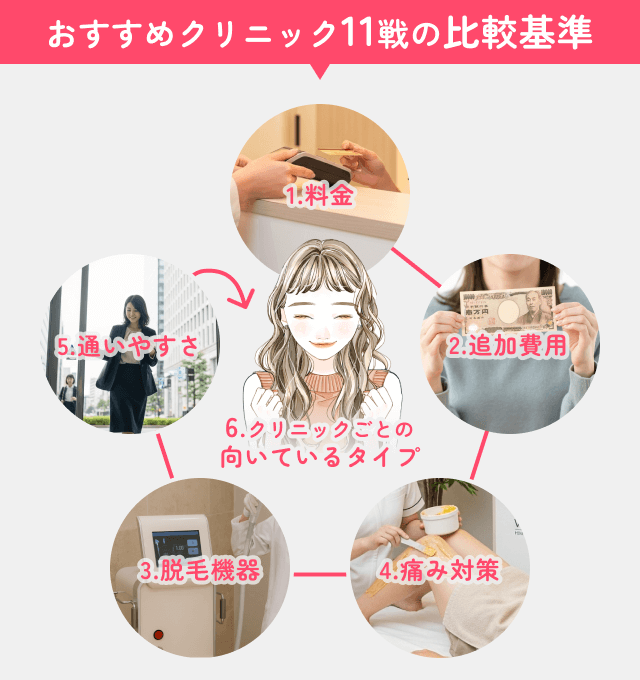 比較軸は「総額」「追加費用」「機器」「痛み対策」「通いやすさ」「どんな人に向いているか」の6つです。