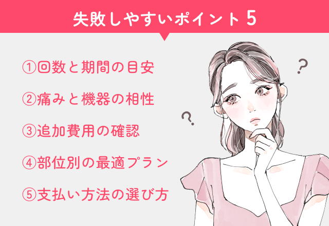 考え方の軸は「とにかく安く始めたい」「痛みが不安」「VIOや顔を安心して任せたい」という3方向です。