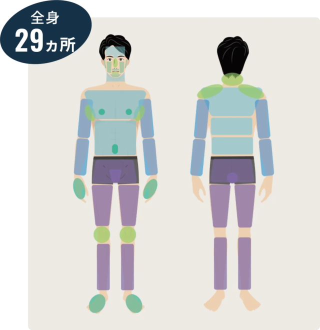 全身脱毛 3回 | 149,100円 | 5,100円 | うなじ・両肩・胸元全体・背中上・両わき・乳輪回り・両ひじ上・背中下・腹部全体・腰・へそ周り・両ひじ |